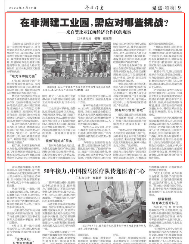 6月19日,《参考消息》09版头条聚焦“在非洲建工业园,需应对哪些挑战?——来自赞比亚江西经济合作区的观察”进行了详细报道。赞比亚江西经济合作区是江西首个获批的境外省级经贸合作区。近年来,中国企业加大对非洲各类经贸园区的建设和投资,推动中非产业链合作。目前,中企在非洲参与规划、建设、运营的各类产业园区超过50个,吸引世界各国企业赴非洲投资,助力非洲工业化。针对园区的未来发展,我校区域国别研究院副教授陈哲副教授接受了参考消息记者采访。